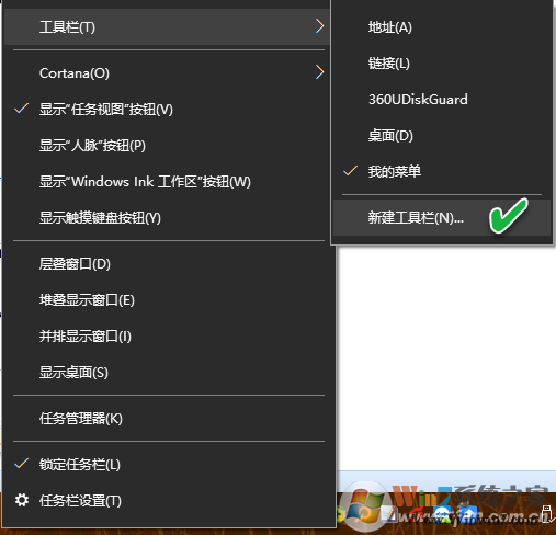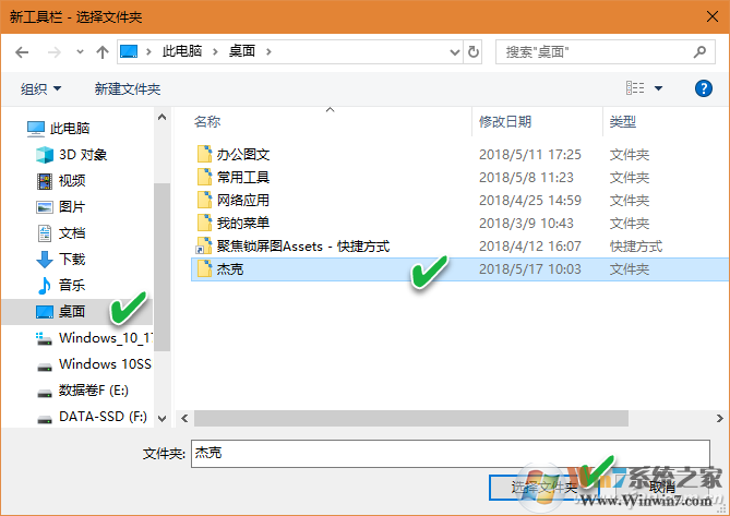 1、首先在桌面上建立一个以自己名字命名的文件夹(例如“杰克”)。右键单击任务栏空白区域,选择快捷菜单命令“工具栏→新建工具栏”(图8);然后选择桌面上的“杰克”文件夹,点击“选择文件夹”按钮(图9)。最后删除桌面上的“杰克”文件夹。