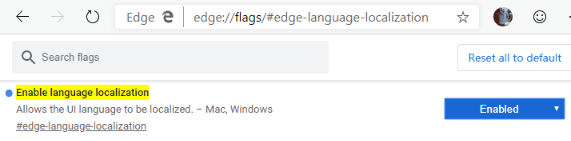 6、此时在Edge浏览器的地址栏中粘贴打开地址 edge://flags/#edge-language-localization,将它由Default设置为Enabled。