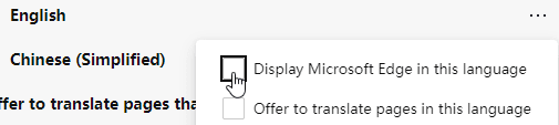 5、添加完成后,点击刚添加语言后的更多按钮(三点),勾选Display Microsoft Edge in this language。当然,可能会遇到无法勾选的灰色状态,如下图。