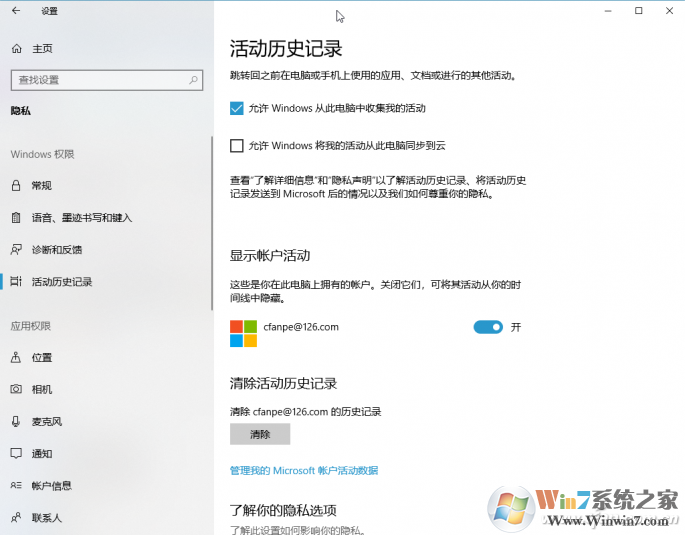 3、在Windows权限→活动历史记录”,在右侧窗格中先点击“清除”按钮清除活动历史记录;然后取消对“允许Windows从此电脑中收集我的活动”的选择,从而让时间线的信息收集功能失效(图4)。如希望恢复时间线历史记录功能,反向设置上述选项即可。