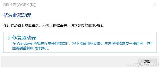 2、因为Windows 10自身就在监控硬盘运行状况,所以在执行检查的时候,如果已经监测出有问题的分区会直接显示修复选项。点击修复即可,修复时间要看硬盘的问题大小和坏道多少,不过总比在进入操作系统前检测修复要快得多,所以建议大家一旦感觉有问题,马上进行检测修复。