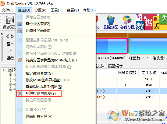 4、另外,如果是使用第三方分区软件进行的分区,或者恰好手头有这些分区工具,可以用它们对硬盘进行一次详细检查,同样能发现和屏蔽坏道。以DiskGenius为例,选择“磁盘-坏道检测与修复”,之后直接磁盘,点击“开始检测”,它就会对整个硬盘表面进行检测,并且确定扇区的健康程度。