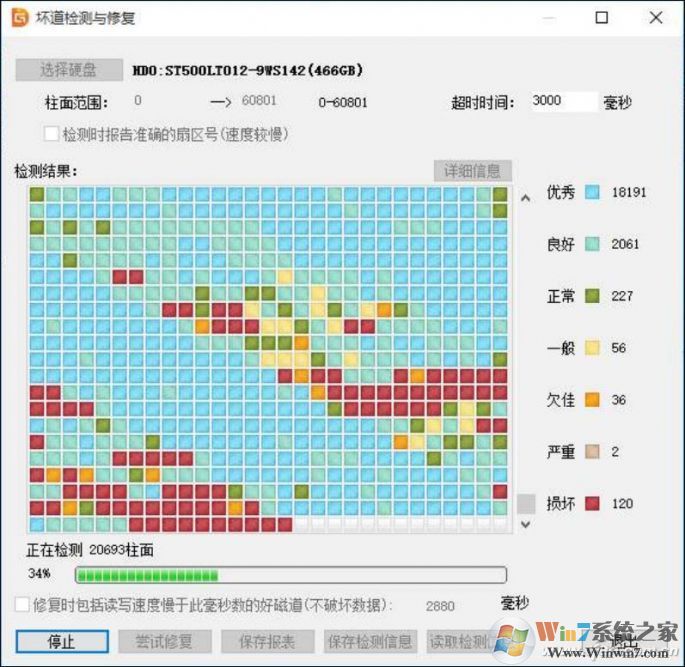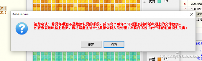 5、全面检测后选择“尝试修复”,这时会出现两个警告,这也是此种修复方式与Windows自带修复最大的不同。它并不会自动抢救和修复数据,甚至还可能影响坏道附近的数据,而Windows则会将“抢救”出的文件存为CHK文件,可通过一些软件进行恢复。