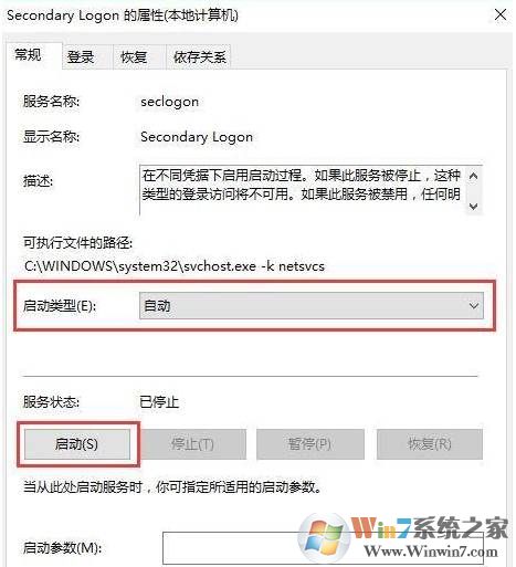 3、更改“启动类型”为自动,然后点击启动按钮,按下确定按钮,重启电脑即可开启secondary logon服务。