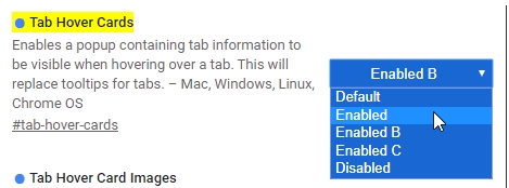 这个选项在新版本Chrome浏览器中是默认开启的,Default相当于Enabled,Enabled B和Enabled C同样表示启用,只不过在延迟显示时间上有所区别,也就是鼠标停留在标签页上多久后才显示预览缩略图。