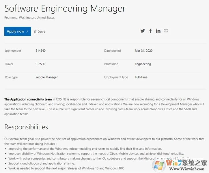 国外媒体Windows Latest报道,其发现微软职业门户网站上发布了一个有趣的职位信息。微软正在为其Application connectivity团队寻求软件工程经理,以改善Windows 10上现有功能,并为Windows 10X做好准备。