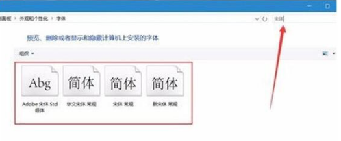 2、在打开的窗口中搜索“宋体”,为了保险起见,把显示的4个字体文件都选中,然后按Ctrl+C复制,粘贴到桌面上;
