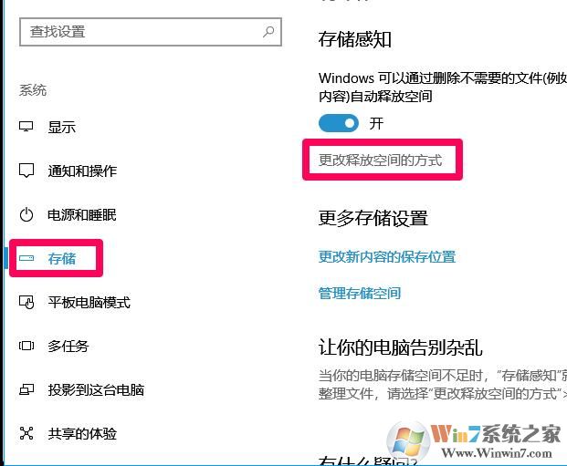 3、选择左侧的“存储”,点击“更改释放空间的方式”