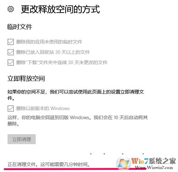 再勾选:删除“下载”文件中连续30天未更改的文件,再勾选:删除以前版本的Windows,最后点击:立即清理