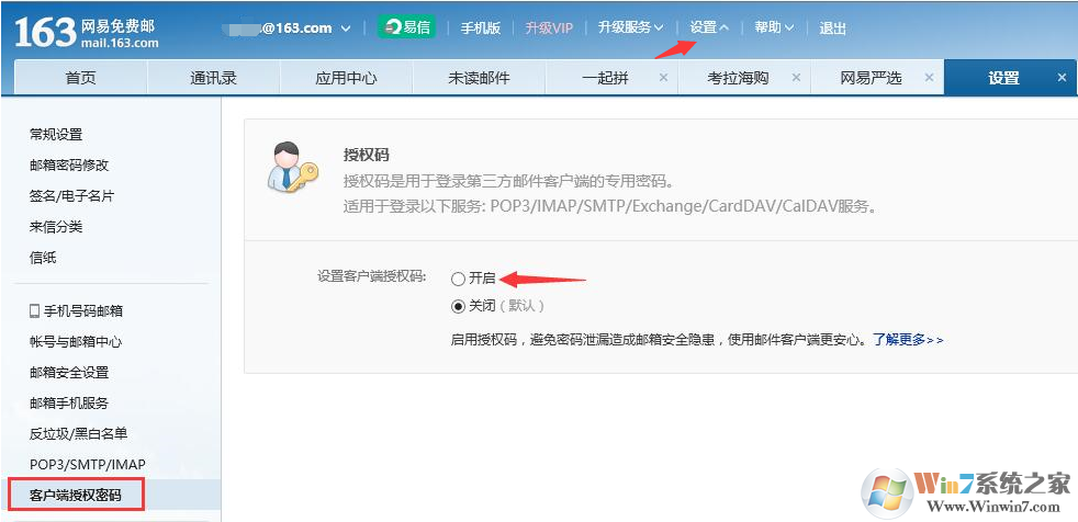 六、举例:163电子邮箱网页版(126邮箱雷同),选择邮箱中“设置”选项,点击左侧“客户端授权密码”,选择“开启”;