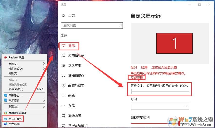 1、在桌面空白处右击打开“显示设置”--将更改文本、应用和其他项目的大小改为100%--然后点击立即注销重启即可生效。
