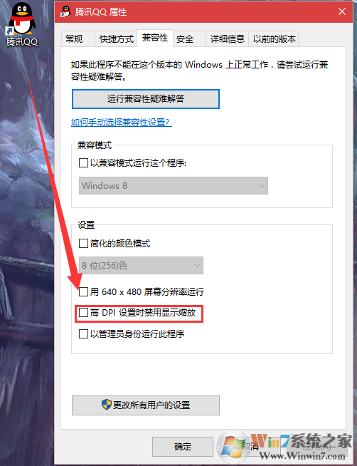 2、为了防止高分辨率下一些软件自动调整DPI,那么我们还需要:右键点击软件图标属性→选择兼容性→勾选高DPI设置时禁用显示缩放。