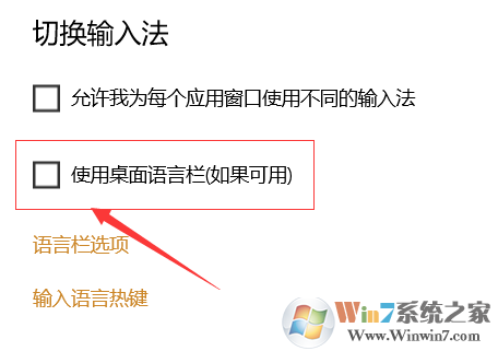 3、最后点击右边的“高级键盘设置”,勾选“使用桌面语言栏(如果可用)”保存设置,可以看到语言栏图标已经显示。