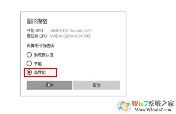 4、选择图形规格下的“高性能”,点击“保存”即可。