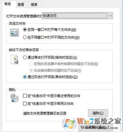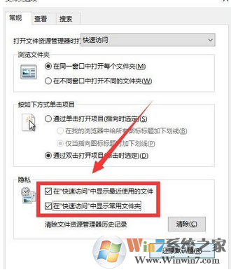 3、在【文件夹选项】界面找到【隐私】,并将【隐私】里面“快速访问”相关选项前面的括号内打上“√”,如图