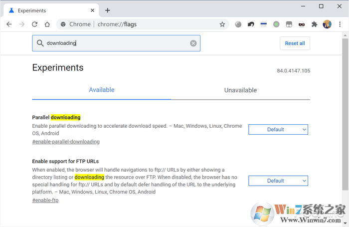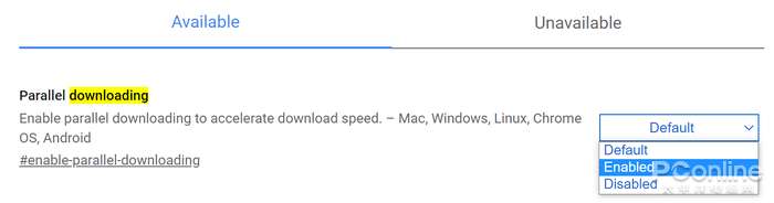 2、在搜索栏中搜索“downloading”,可以看到一个“Parallet download”的选项,这是多线程下载的意思。这个选项默认是处于“Default”档位关闭的,将它改成“enable”,就可以开启Chrome的多线程下载支持了。