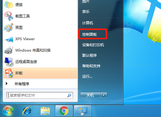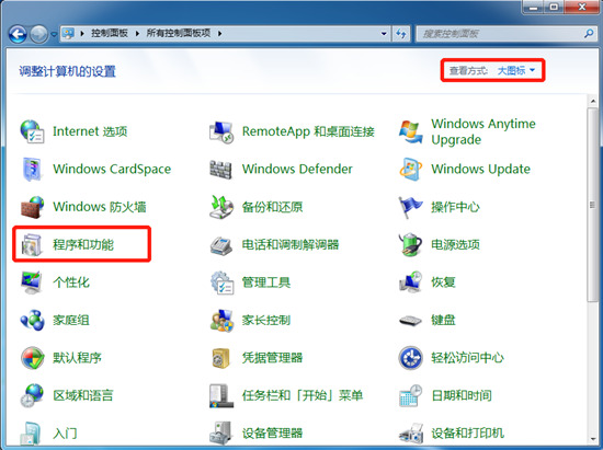 2.在选择“大图标”的查看方法,找到并点击打开“程序和功能”;