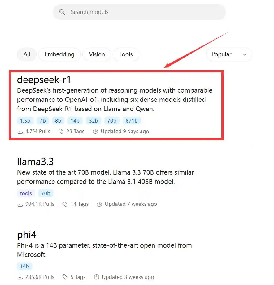 2、进入就可以看到deepseek-r1模型,如果没有,在搜索栏搜索即可。