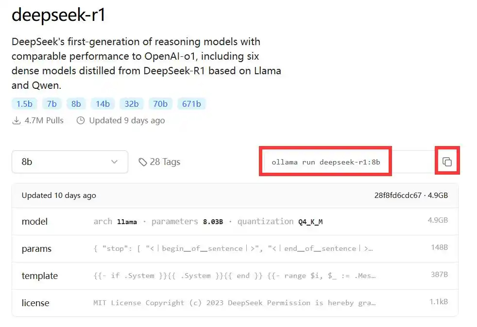 3、选择对应的模型来下载,1.5b、7b、8b、14b、32b、70b或671b,这里有很多版本可选,模型越大,要求电脑内存、显卡等的配置越高。老宅这台机子是4060的显卡,选择8b的模型。