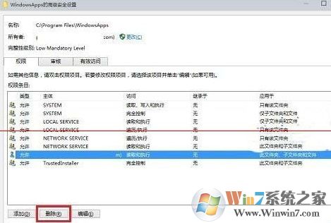 2、在win10系统xitongcheng.com/win10/中WindowsApps的高级安全设置界面,点击选中当前用户,然后点击底部“删除”