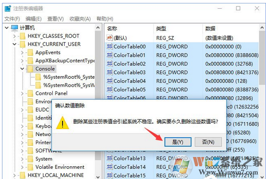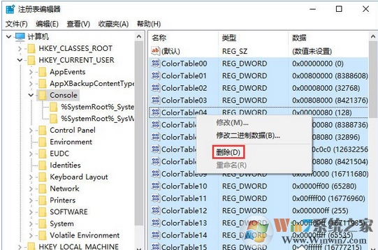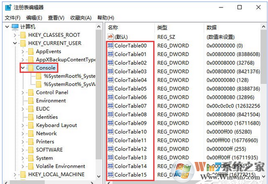 2、将注册表转至HKEY_CURRENT_USER\Console项,找到右侧的ColorTable00~ColorTable15,并选中,如图。