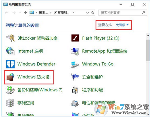 2、点击Windows防火墙(现将查看方式改成大图标,即可找到);