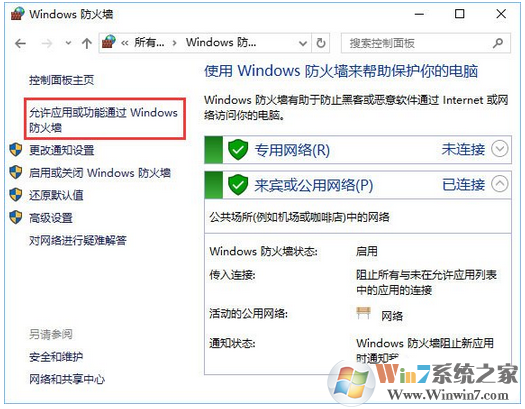 3、点击窗口左侧的【允许应用或功能通过Windows防火墙】;