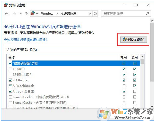 4、在Windows防火墙 - 允许应用窗口,点击:更改设置,如图下: