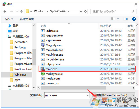7、定位到C:\Windows\System32 (64位系统定位到C:\Windows\SysWOW64),找到mmc.exe,找不到的话先打开该路径,然后在右上角搜索 mmc.exe 选中后点击打开;