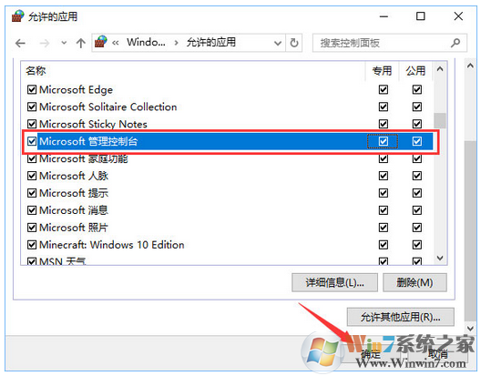 9、我们可以看到mmc.exe已经添加到允许的应用和功能列表中,将“专用”和“公用”的复选框都勾选,点击确定保存即可!