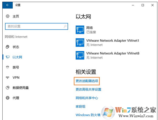 2、在网络和Internet界面,点击左侧“以太网(无线网络请点击WLAN)”,然后在右侧窗口点击“更改网络适配器设置”。