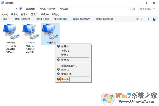 3、在网络连接窗口,对着以太网单击鼠标右键,菜单中选择“属性”。