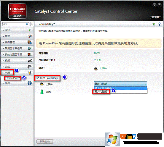 3、点击“电源”--“PowerPlay”--“启用PowerPlay”--“最大化性能”;