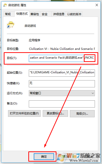 3、在目标栏中的目标后按一个空格后输入/NCRC
