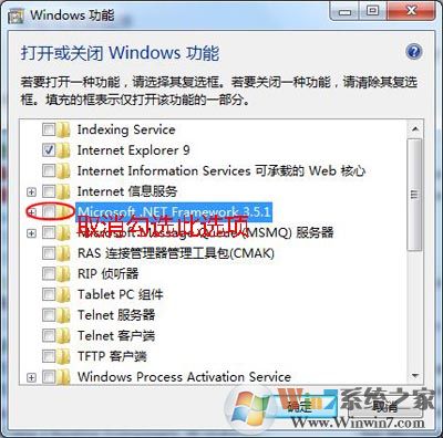 打开“控制面板”---“程序与功能”---“打开或关闭Windows功能”---去掉".net framework 3.5"前的勾,然后点击确定。