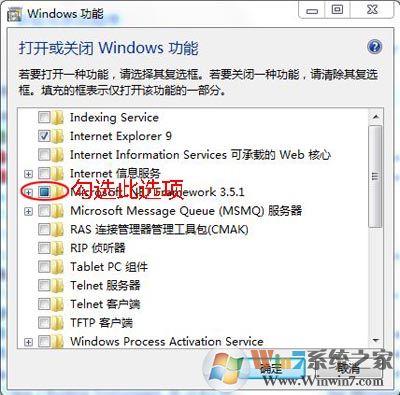 带Windows更改功能完成之后,请您再到“打开或关闭Windows功能”-勾上".net framework 3.5.1"前的勾,然后点击确定。