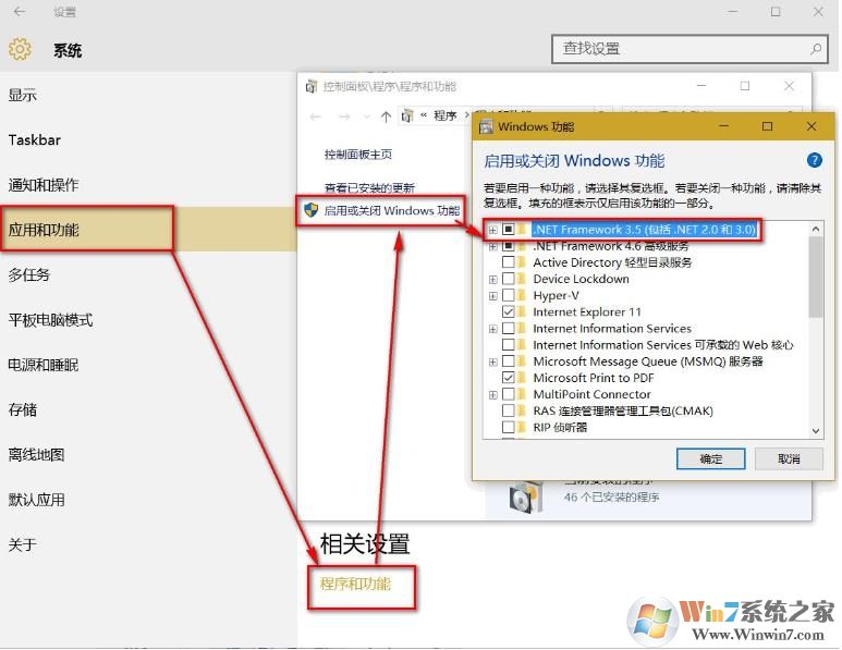 直接点击【控制面板】-【程序】【程序和功能】-【打开或关闭windows功能】,找到NET3.5,我本机是在最上面,将两个子选项都选上,确定后会自动联网下载完成安装。