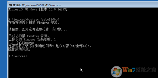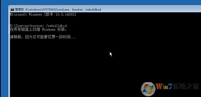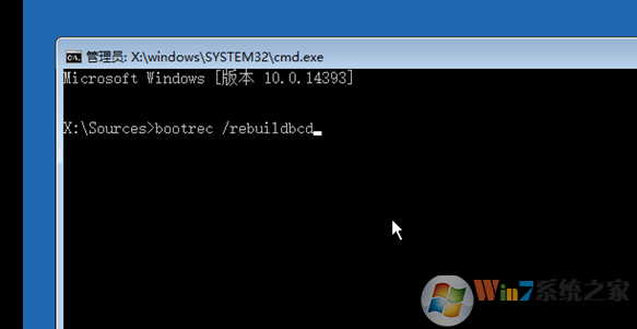 5、输入命令bootrec /rebuildbcd回车【参考图片,注意空格】;