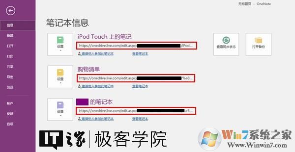 在OneNote 2016中,点击Robbin功能区中的文件-信息,你将在此看到你所有的OneNote笔记,在这些笔记的下方,你可以看到它们对应的链接。