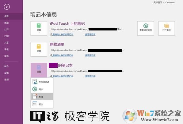 点击Robbin功能区中的文件-信息,你将在此看到你所有的OneNote笔记,选择你的目标笔记,点击它前面的设置按钮,在它的下拉菜单中点击关闭。