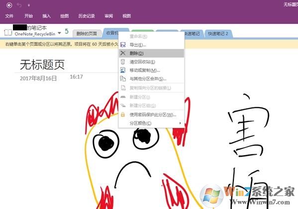 你将看到被你删除过的笔记分区,在被你删除的笔记分区上点击鼠标右键,再点击删除,直至删除回收站里的所有OneNote笔记分区,问题应该就会得到解除了。