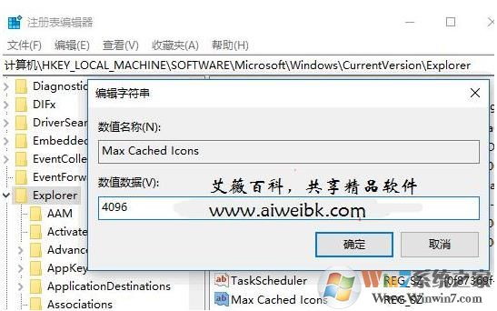 3、然后在右侧窗口中找到名为Max Cached Icons的字符串值(如果没有,就新建一个)。然后把Max Cached Icons的数值数据设置为 4096 ~ 8192 之间的一个数值,如果设置为4096,那么桌面图标的缓存空间就是4M。