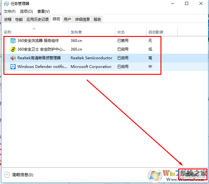 3.点击”启动”标签卡, 点击”打开任务管理器”,然后禁用全部启动项并确定。