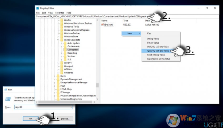 - 备份准备就绪后,使用左窗格导航到DDHKEY_LOCAL_MACHINE \\ SOFTWARE \\ Microsoft \\ Windows \\当前版本\\ WindowsUpdate \\ OSUpgrade项。