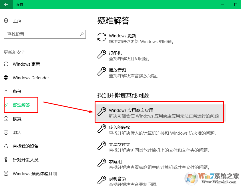 2、点击疑难解答,然后找到应用商店应用疑难解答。