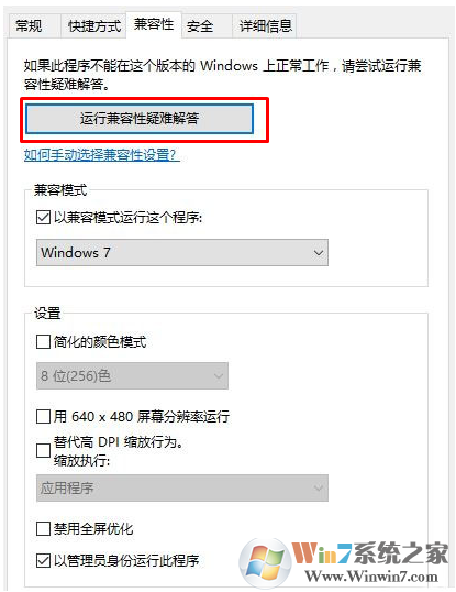 3、如果疑难解答不能解决此问题,那么我们可以执行以下操作。在属性窗口切换到【兼容性】选卡,在下面勾选 兼容模式,在以兼容模式运行这个程序下拉菜单选择【windows 7】并在下面勾选【以管理员身份运行此程序】,点击确定保存设置即可!