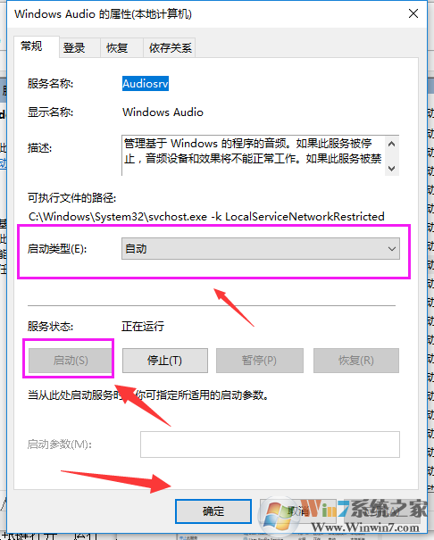 3、双击打开Windows Audio服务的属性 ,点击“启动”按钮启动服务,如果开机启动该服务,可以将“启动类型”设置为自动。要关闭服务,点击“停止”按钮停止服务,如果开机不启动此服务,可以将“启动类型”设置为“禁用”。