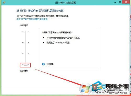 3、在出来的这个框框中,把它调成从不通知。然后确定就可以了。