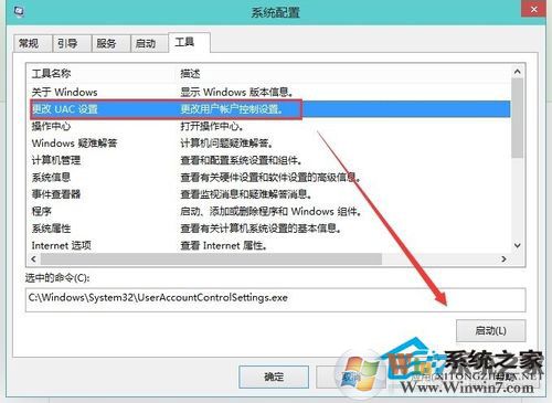 2、在系统配置工具,下面选择点击更改UAC设置然后再点击启动。