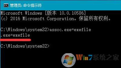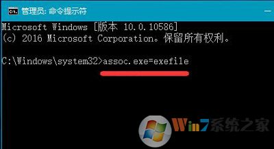2、打开命令提示符窗口后,输入assoc.exe=exefile命令,然后按回车,如图所示:
